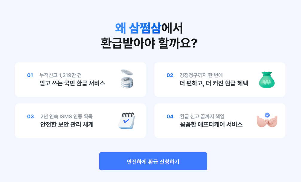 • 다만 수수료가 발생하므로 환급액이 적다면 직접 신청을 고려하세요.